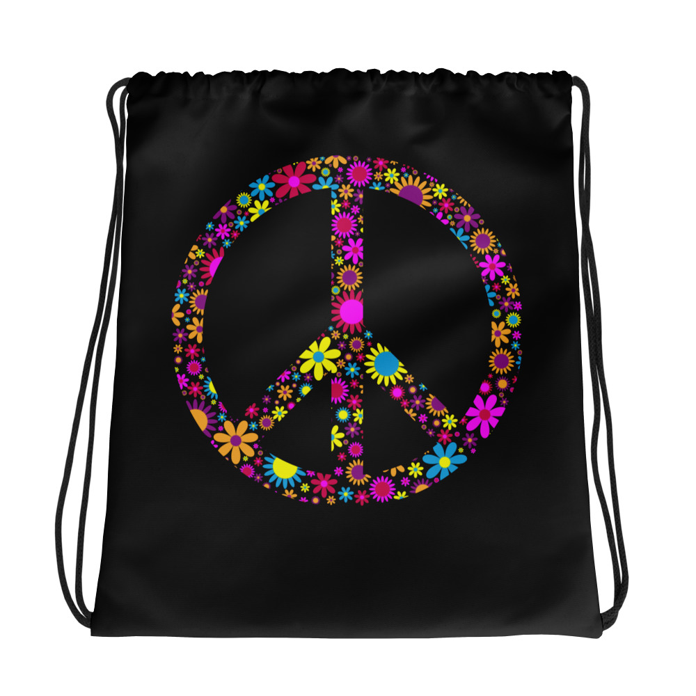 Combine your love for vibrant prints and a sporty style with a cool WTees Flower Power Peace Sign Drawstring Bag Black. It's a must-have gym essential that can be worn as a backpack with drawstring closure at top, and narrow, contrasting shoulder straps.