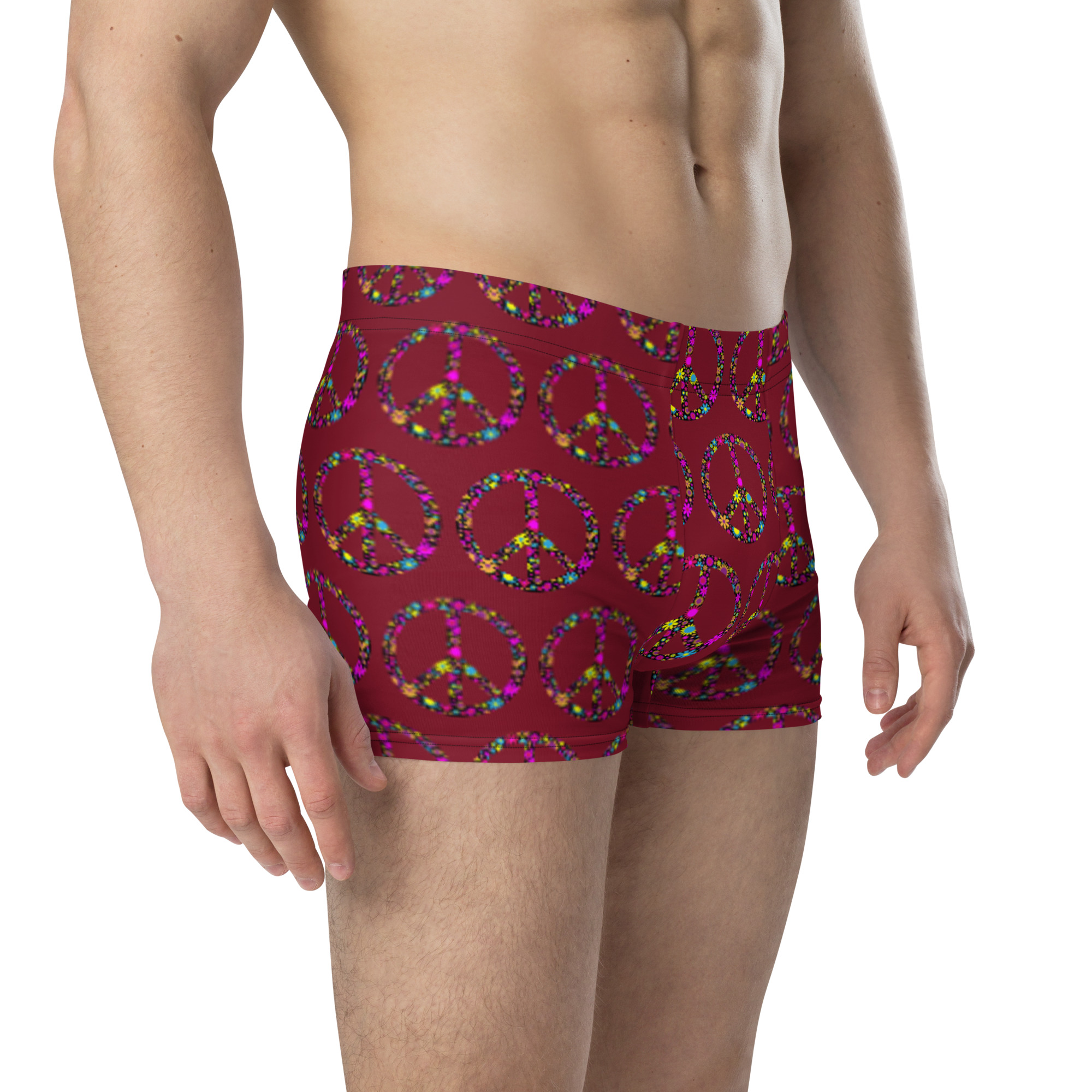 WTees Flower Power Peace Sign Trunk Boxer Briefs Maroon are made from a soft and stretchy material that ensures comfort throughout the day. The boxer briefs have no back seam, and they feature a lined front pouch for extra comfort and support.
