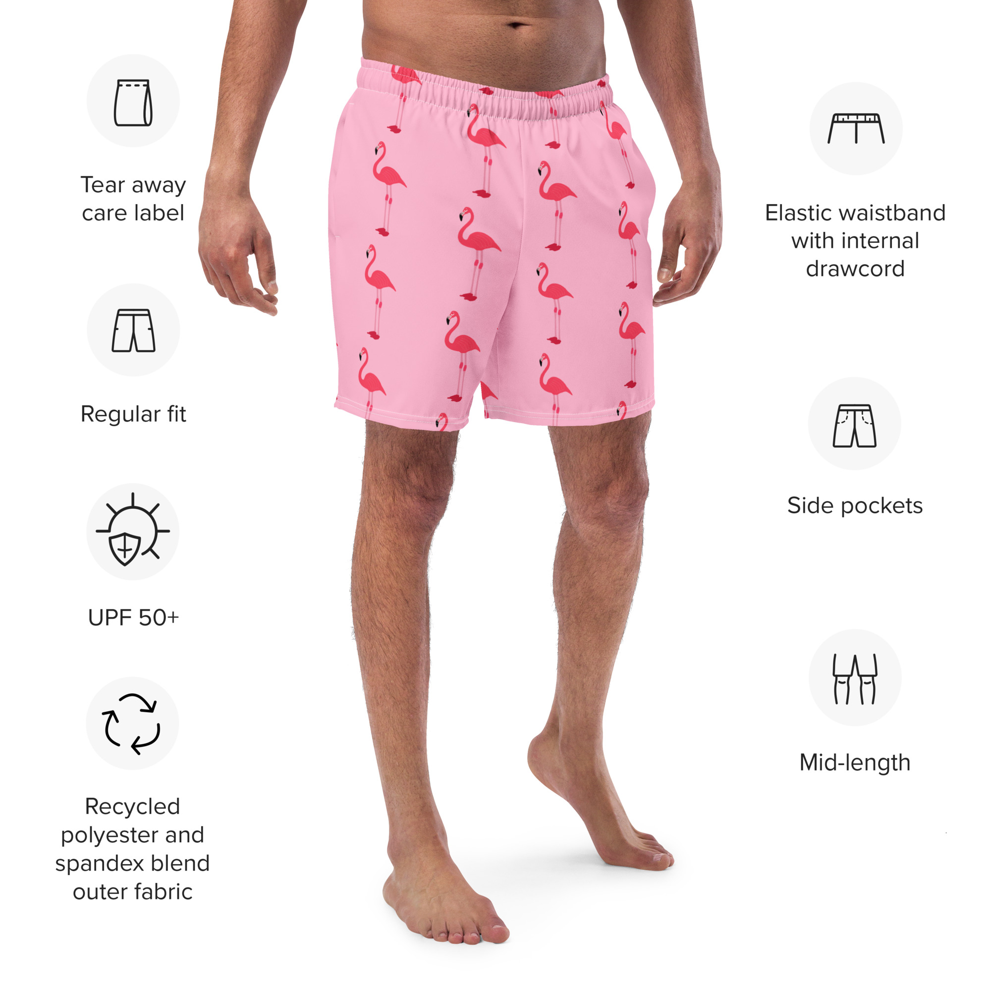 Order your WTees Pink Flamingos Men's Swim Trunks today and make a splash this summer!